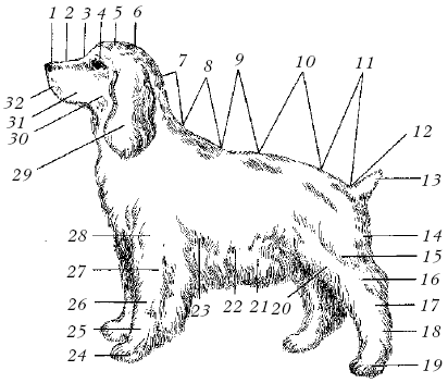 Стати спаниеля: 1 – мочка носа; 2 – спинка носа; 3 – переход ото лба к морде; 4 – надбровная дуга; 5 – лоб; 6 – затылочный бугор; 7 – шея; 8 – холка; 9 – спина; 10 – поясница; 11 – круп; 12 – корень хвоста; 13 – хвост; 14 – седалищный бугор; 15 – бедро; 16 – голень; 17 – скакательный сустав; 18 – плюсна; 19 – задняя лапа; 20 – колено; 21 – пах; 22 – живот; 23 – грудь; 24 – передняя лапа; 25 – пясть; 26 – предплечье; 27 – локоть; 28 – плечо; 29 – ухо; 30 – скула; 31 – морда; 32 – губы