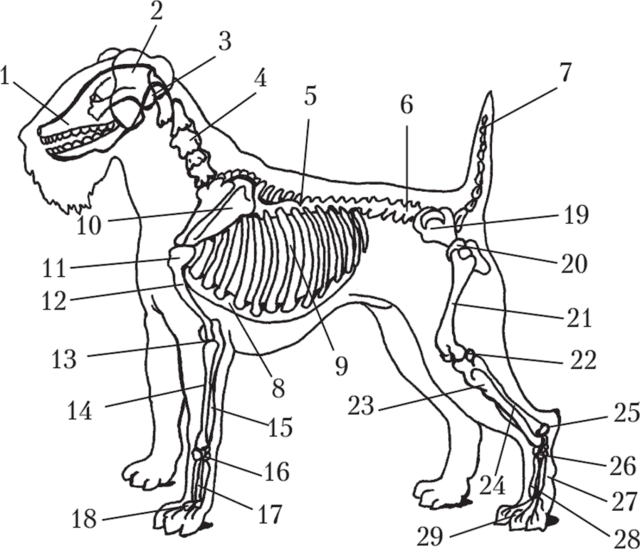 Скелет собаки: 1 – лицевая часть (морда); 2 – черепная часть; 3 – первый шейный позвонок (атлант); 4 – шейные позвонки; 5 – грудные позвонки; 6 – поясничные позвонки; 7 – хвостовые позвонки; 8 – грудная кость; 9 – ребра; 10 – лопатка; 11 – плечелопаточный сустав; 12 – плечевая кость; 13 – локтевой сустав; 14 – лучевая кость; 15 – локтевая кость (обе образуют предплечье); 16 – запястье; 17 – пясть; 18 – пальцы (лапа); 19 – таз; 20 – тазобедренный сустав; 21 – бедренная кость; 22 – коленный сустав; 23 – большая берцовая кость; 24 – малая берцовая кость (обе образуют голень); 25 – пяточная кость; 26 – скакательный сустав; 27 – предплюсна; 28 – плюсна; 29 – пальцы (лапа).