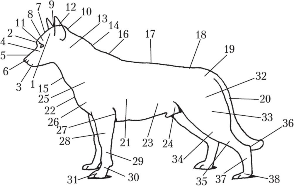 Стати собаки: 1 – черепная часть головы; 2 – переход от лба к морде (перелом); 3 – морда; 4 – скулы; 5 – спинка носа; 6 – мочка носа; 7 – лоб; 8 – надбровные дуги; 9 – темя; 10 – затылочный бугор; 11 – глаз; 12 – ухо; 13 – шея; 14 – гребень шеи; 15 – горло; 16 – холка; 17 – спина; 18 – поясница; 19 – круп; 20 – хвост; 21 – грудь; 22 – передняя часть груди; 23 – живот; 24 – пах; 25 – плечо; 26 – плечелопаточное сочленение; 27 – локоть; 28 – предплечье; 29 – запястье; 30 – пясть; 31 – передняя лапа; 32 – маклок; 33 – бедро; 34 – колено; 35 – голень; 36 – скакательный сустав и пятка; 37 – плюсна; 38 – задняя лапа