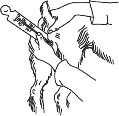 Термометрия. Определение температуры проводят ректально в течение не менее 10 минут. Более удобны контактные электротермометры. У здоровых собак температура тела колеблется в пределах 37,5–39,0 °С.