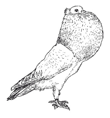 Клюв средней длины, лежит на раздутом зобе. Цвет его зависит от общей окраски оперения. У одноцветных белых, красных, желтых, изабелловых и с рисунком монаха птиц клюв должен иметь окраску от белой до розоватой. У палевых желтопоясых, краснопоясых и серебристых голубей он розовый, а у синих, синих крупчатых и черных – черный.