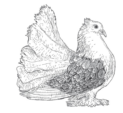 Спина и грудная часть у индийского павлина широкие. Крылья опущены ниже хвоста. Толстая шея, не трясется. Отличие от вышеупомянутых павлинов заключается в том, что эти голуби имеют оперенные ноги и чуб на голове. Хвост слегка воронкообразный, выпрямлен выше уровня тела. Между шеей и хвостом расстояние не более 4 см. Цвет глаз темный, жемчужный или оранжевый. Бывают различные варианты окрасов оперения.