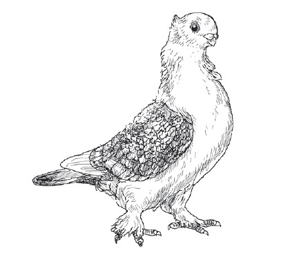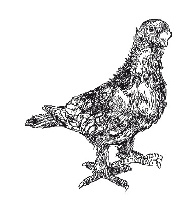 Шея короткая, полная, вертикально поставленная с манишкой, а сзади гребнем, который является продолжением чуба. Подбородок полный, с хорошо развитой кожной складкой. Грудь широкая, высоко приподнятая, округло-выпуклая. Спина короткая, широкая, выпуклая, покатая к хвосту. Ноги короткие со среднеоперенной плюсной, пальцы ярко-красные (могут быть неоперенные).