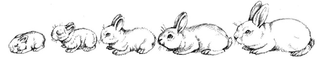 Крольчата рождаются слепыми и голыми, с 16 молочными зубами. На 5–7 сутки у них появляется волосяной покров длиной 5–6 мм, состоящий из остевых и направляющих волос. К 20–25 дню первичный волосяной покров достигает полного своего развития. Если поросенок удваивает свой вес к 15-дневному возрасту, ягненок – к 18, теленок – к 47 дням, то крольчонок достигает таких результатов к 6 дням, а к 30-дневному возрасту он увеличивает живой вес в 10–12 раз. От одной самки и ее приплода за год можно получить более 100 кг мяса.