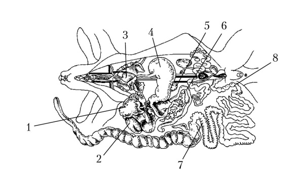 1 – сердце; 2 —легкие; 3 – печень; 4 – желудок; 5 – селезенка; 6 – отдел тонких кишок; 7 – отдел толстых кишок; 8 – мочевой пузырь
