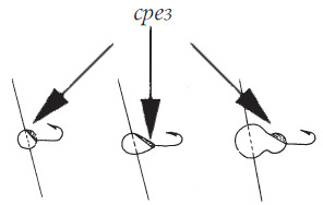Мормышки на плотву я использую следующие: дробинки от 2 до 4 мм, капельку, овсяночку. Уралка больше подходит для окуня, однако некоторые авторы утверждают обратное. Магазинные мормышки обычно приходится дорабатывать самому. Сразу за крючком я выпиливаю надфилем площадки, не залезая на отверстие для лески. Площадка должна быть ровной, это создает дополнительную игру, т. е. движение назад (рис. 8).