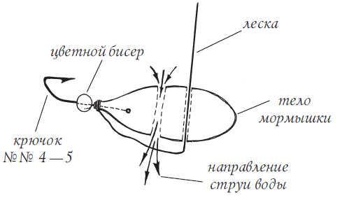 Самое интересное, что если отверстие в мормышке ничем не заполнять, то образующаяся струйка воды также привлекает водных обитателей. Размышляя на эту тему, я пришел к выводу, что все водные организмы так или иначе пропускают воду через себя, взять, например, систему рот— жабры. Во всяком случае, используя «дырявую» приманку, я возвращался с богатым уловом (рис. 6).