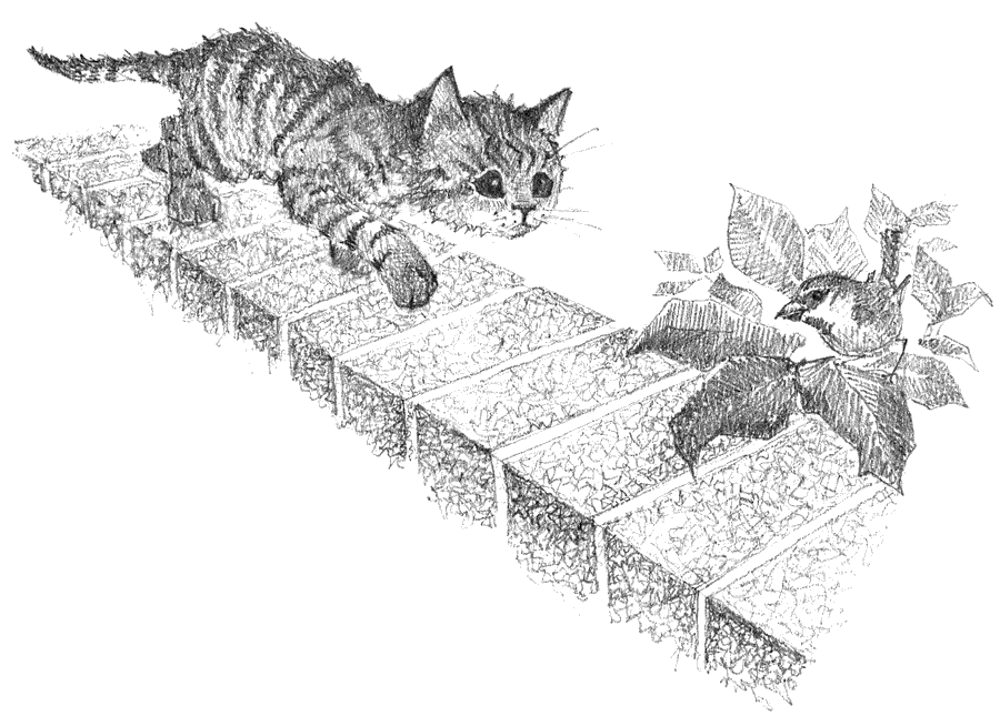 Тигр забрался на стену между садом и переулком. Раньше ему этот прыжок оказался бы не под силу, но теперь он немного подрос и сумел туда запрыгнуть со спинки садовой скамьи, хоть и с трудом. Отсюда он мог выйти в палисадник перед домом, а там сидеть на стене и наблюдать за прохожими и машинами или даже спрыгнуть на тротуар. Улица манила интересными запахами, а на дереве в соседнем саду всегда щебетали воробьи. Ему пока не удалось поймать ни одной птицы, но он и не думал сдаваться.