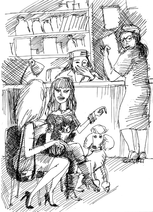 Ирина Леонидовна стояла у стойки администратора и просматривала запись пациентов. И тут услышала разговор двух гламурных блондинок. У одной на руках сидел йоркширский терьер в бантиках со стразами, а возле второй стоял шикарный белоснежный королевский пудель, на котором был ошейникне без страз. Ну и сами дамы выглядели соответственно – одинаково розово-стразово-силиконовые.